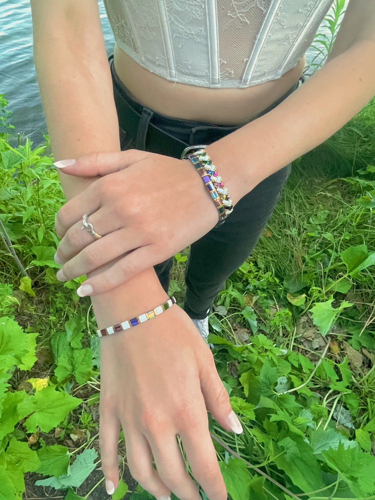 This collection is packed full of bracelets made from the popular magic dark blue beads that shift to a variety of different colors! This makes these pieces be able to go with almost any outfit since their appearance changes based on what you are wearing. These bracelets are simply jaw dropping in the sun which allows you to see all of the chrome color variations the best. Each of these bracelets have a strong magnetic clasp and lapis lazuli accent beads around it.