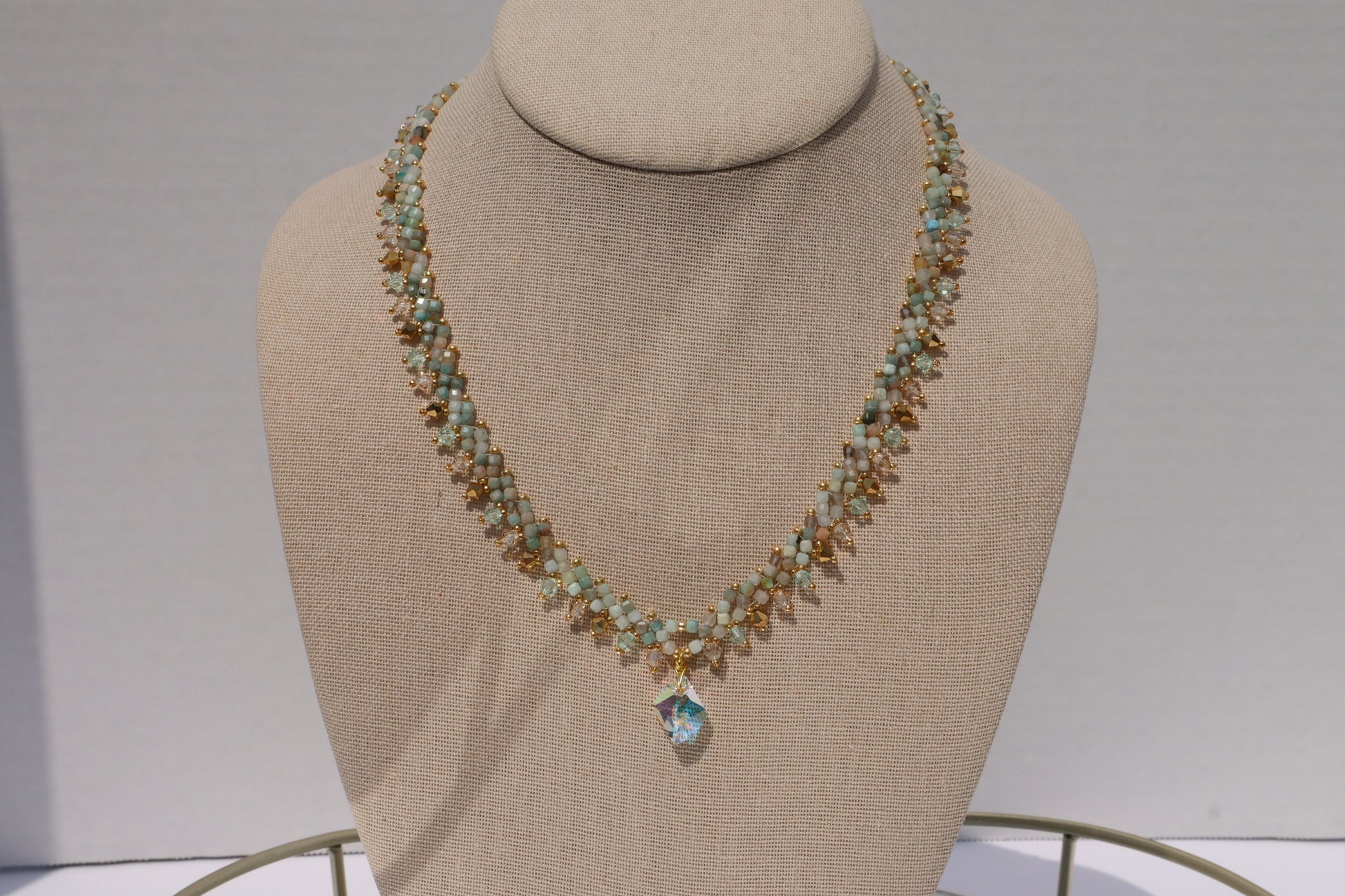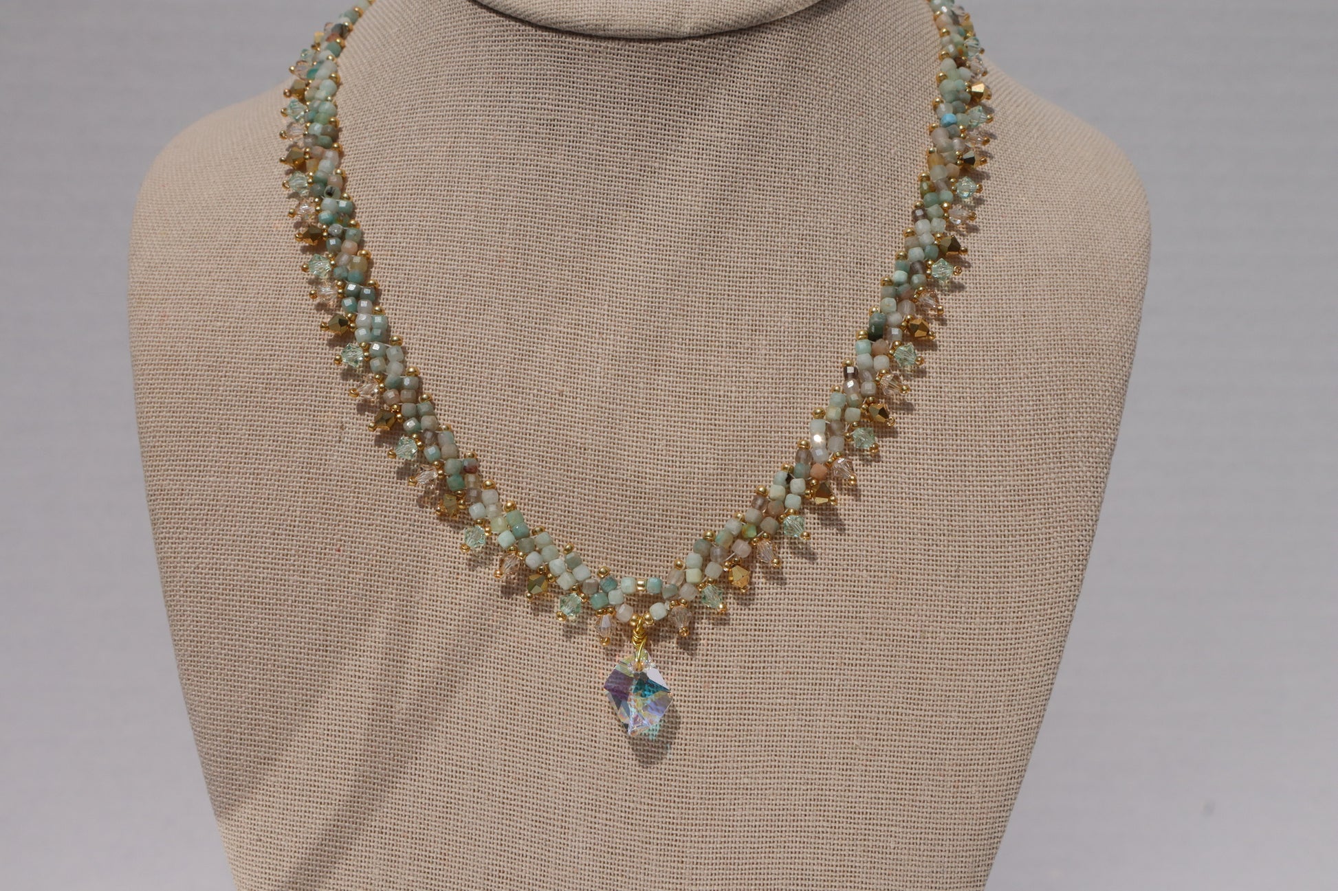 This necklace is made from real amazonite stone beads with a preciosa crystals outlay, with starlight gold seed beads, a 14kt gold with cubic zirconia clasp, and a swarovski crystal leaf center.