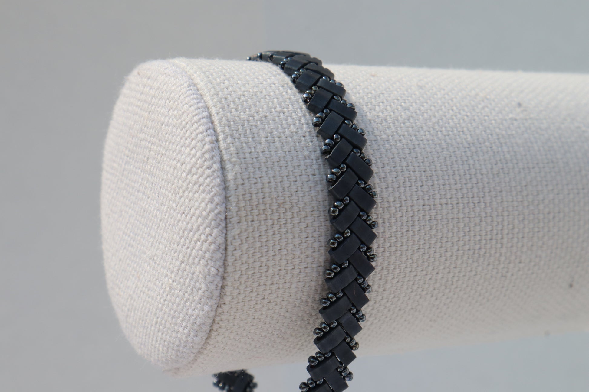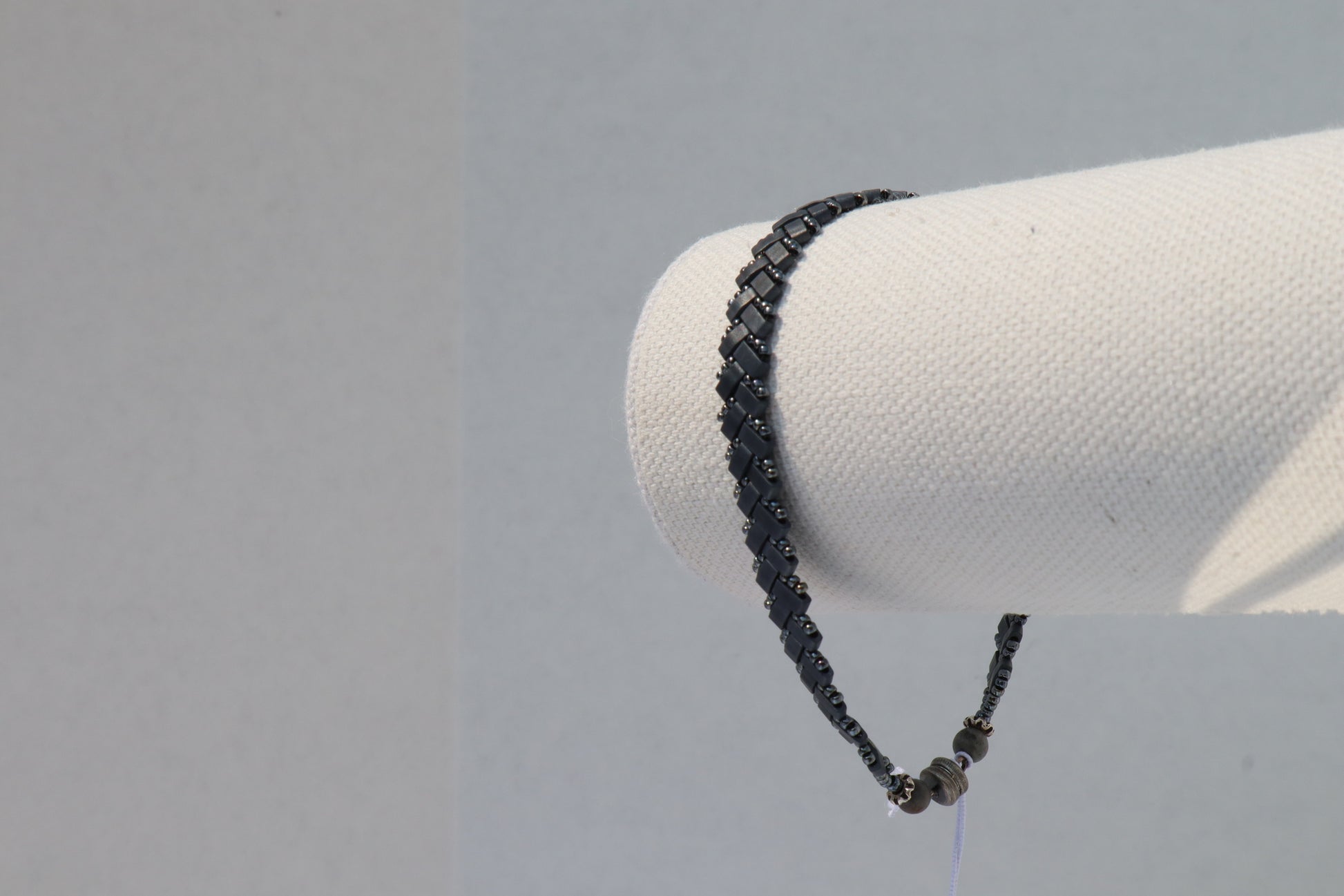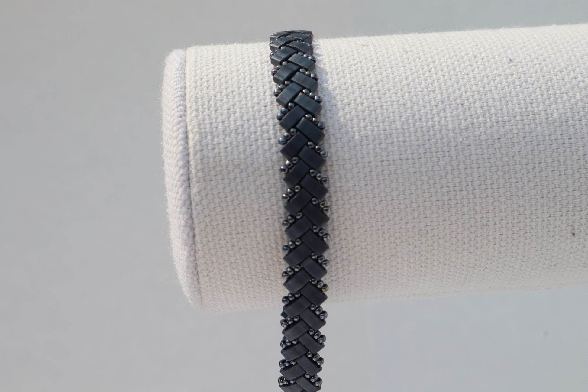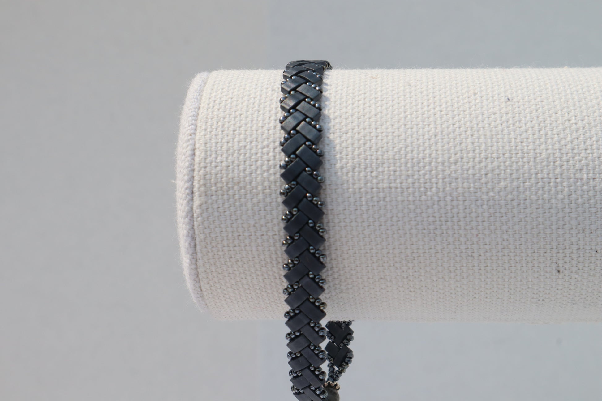 This sleek bracelet can be worn by men or women and looks great with jeans! It is made from high quality glass beads with gunmetal colored spacer beads with a black network stone accent around the magnetic clasp enclosure.