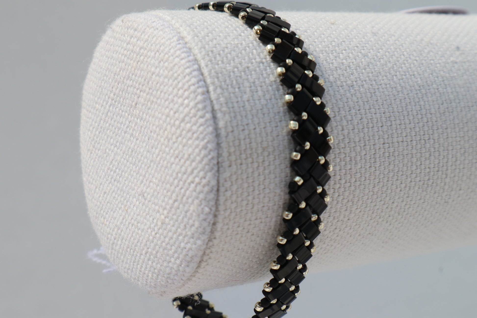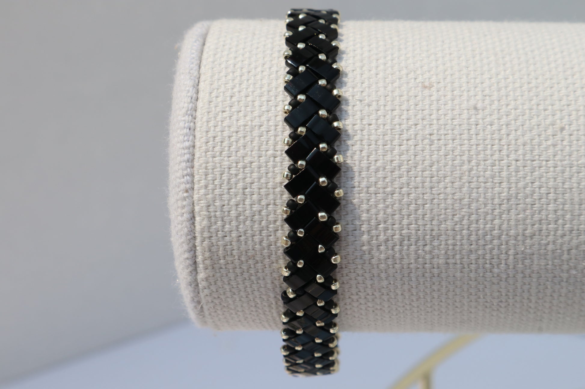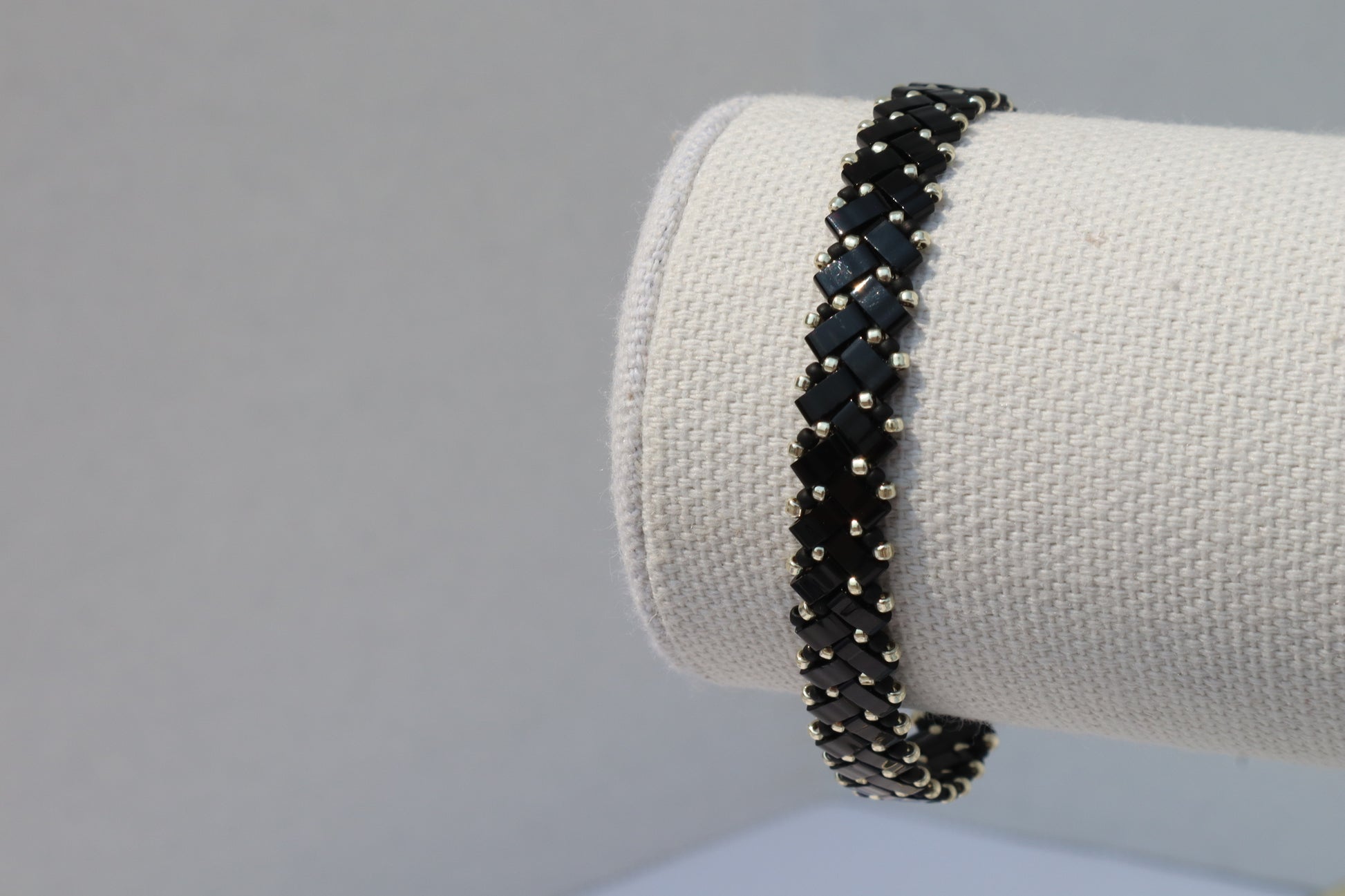 This bracelet is made of high quality glass beads in the color shiny black accompanied with galvanized silver colored and matte black colored beads. This bracelet has a magnetic clasp with network stone accent beads around the enclosure.