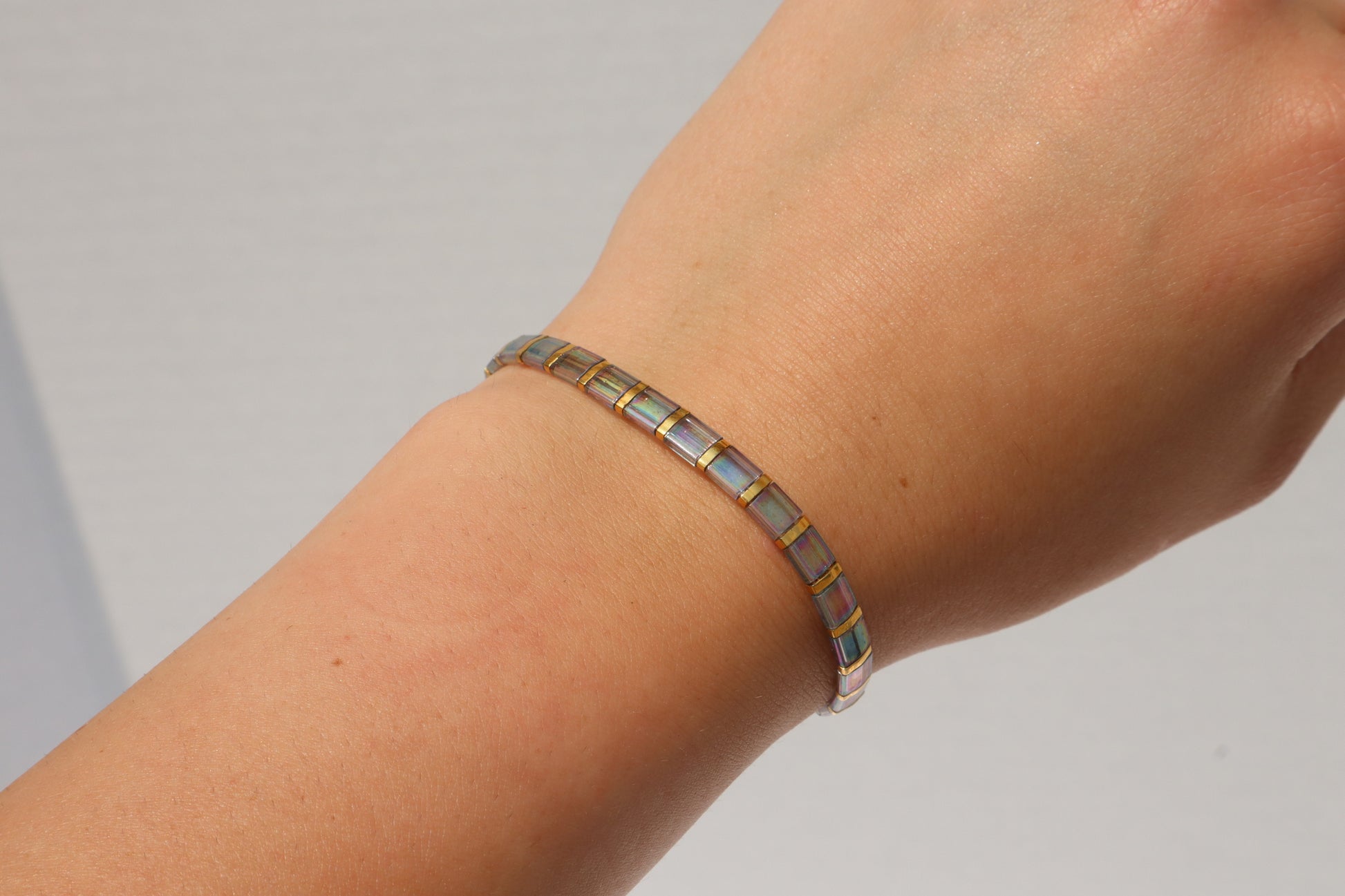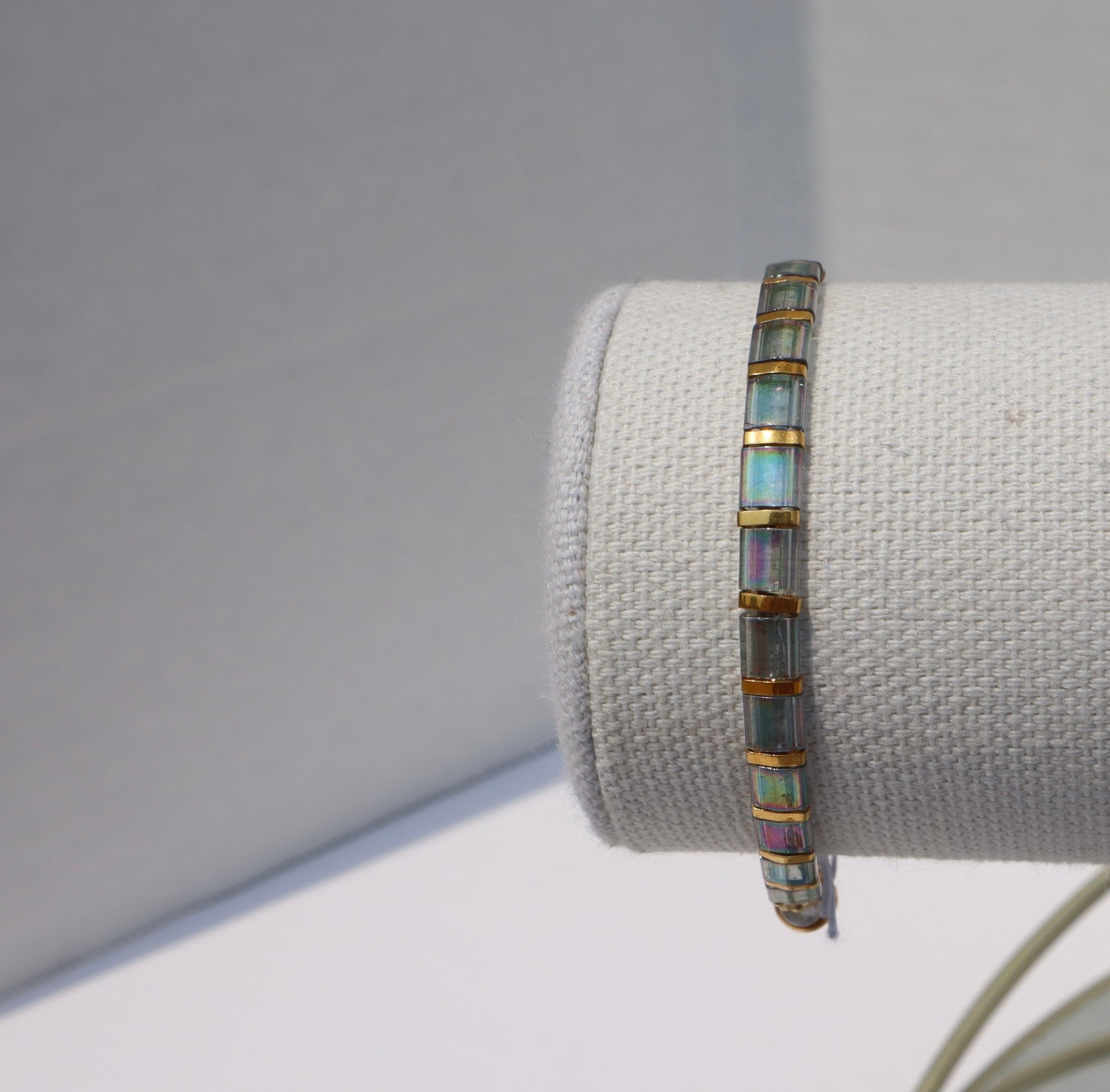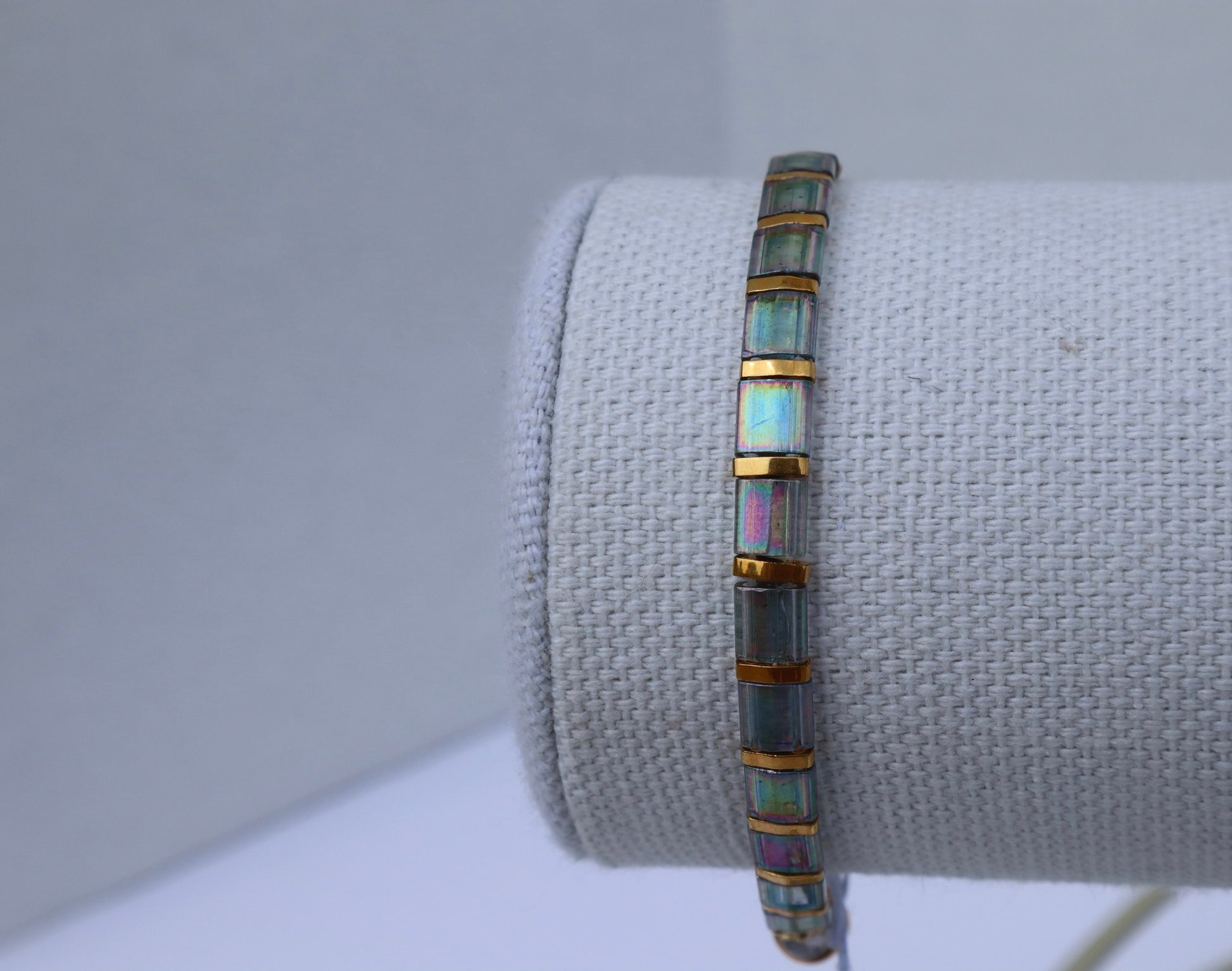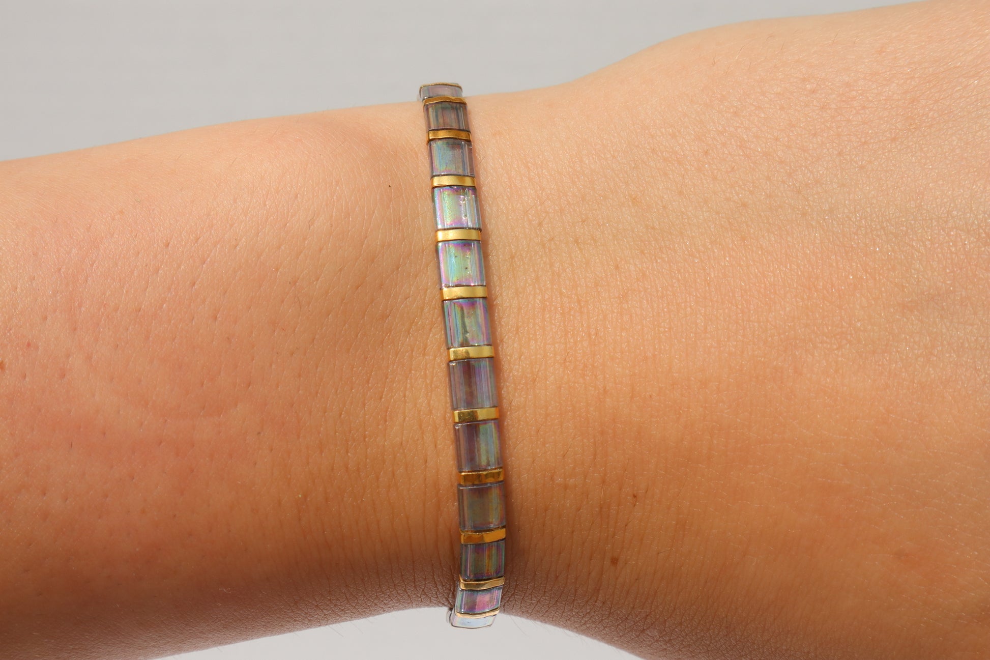 This stunning straight tila bracelet is beautiful and light, sometimes you will forget you even have it on! It looks great on its own but pairs very nicely with any of the other bracelet styles including itself. This bracelet is made of high quality glass beads in a grey/ blue luster color with 24kt gold plated accent beads in between the beads the bracelet. It also has a strong magnetic clasp enclosure with black and white fire agate stone beads around it.
