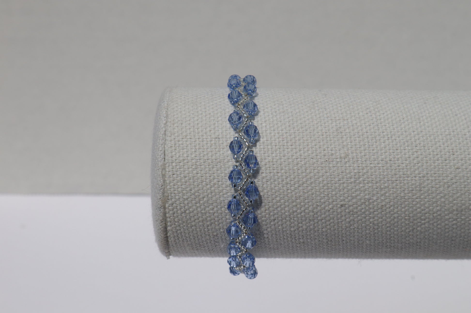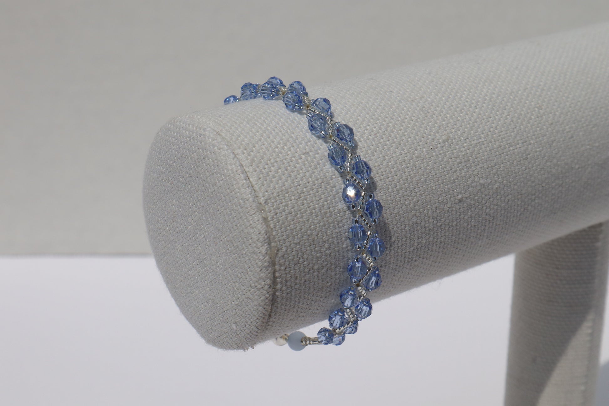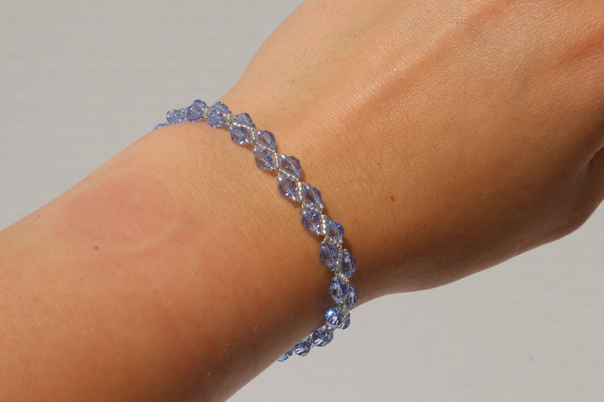 This spiraling beaded bracelet is made from real swarovski crystals in a elegant periwinkle blue color with glass silver lined and a glass sapphire blue lined seed beads.