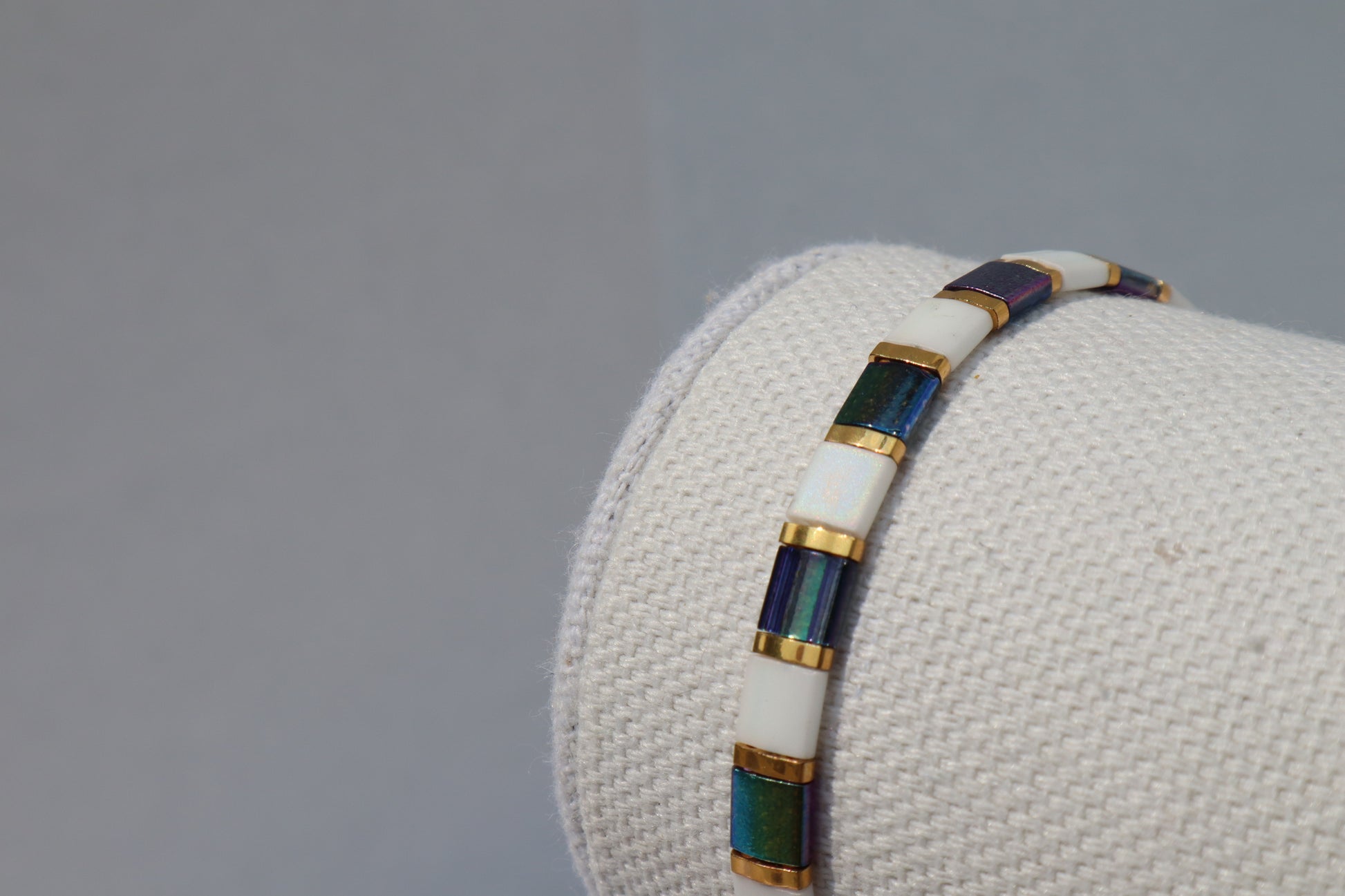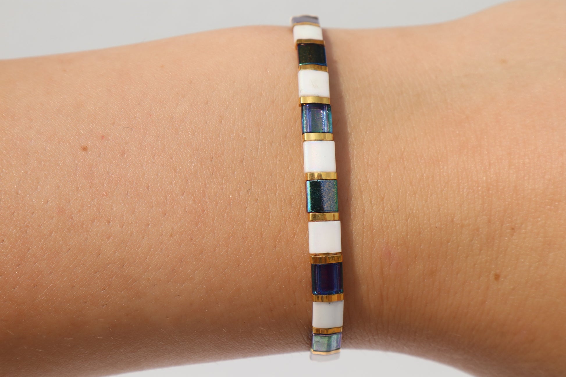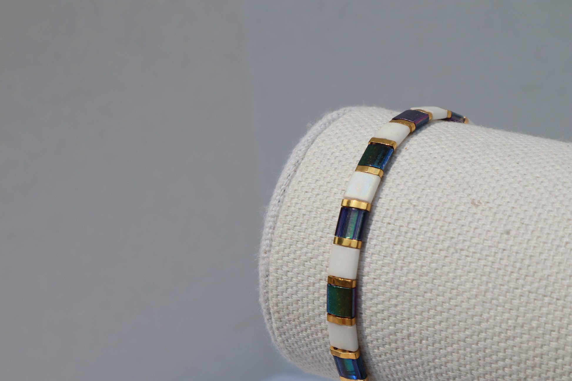 Magic Blue and Matte White AB Straight Tila Bead Bracelet with 24kt gold Accent beads