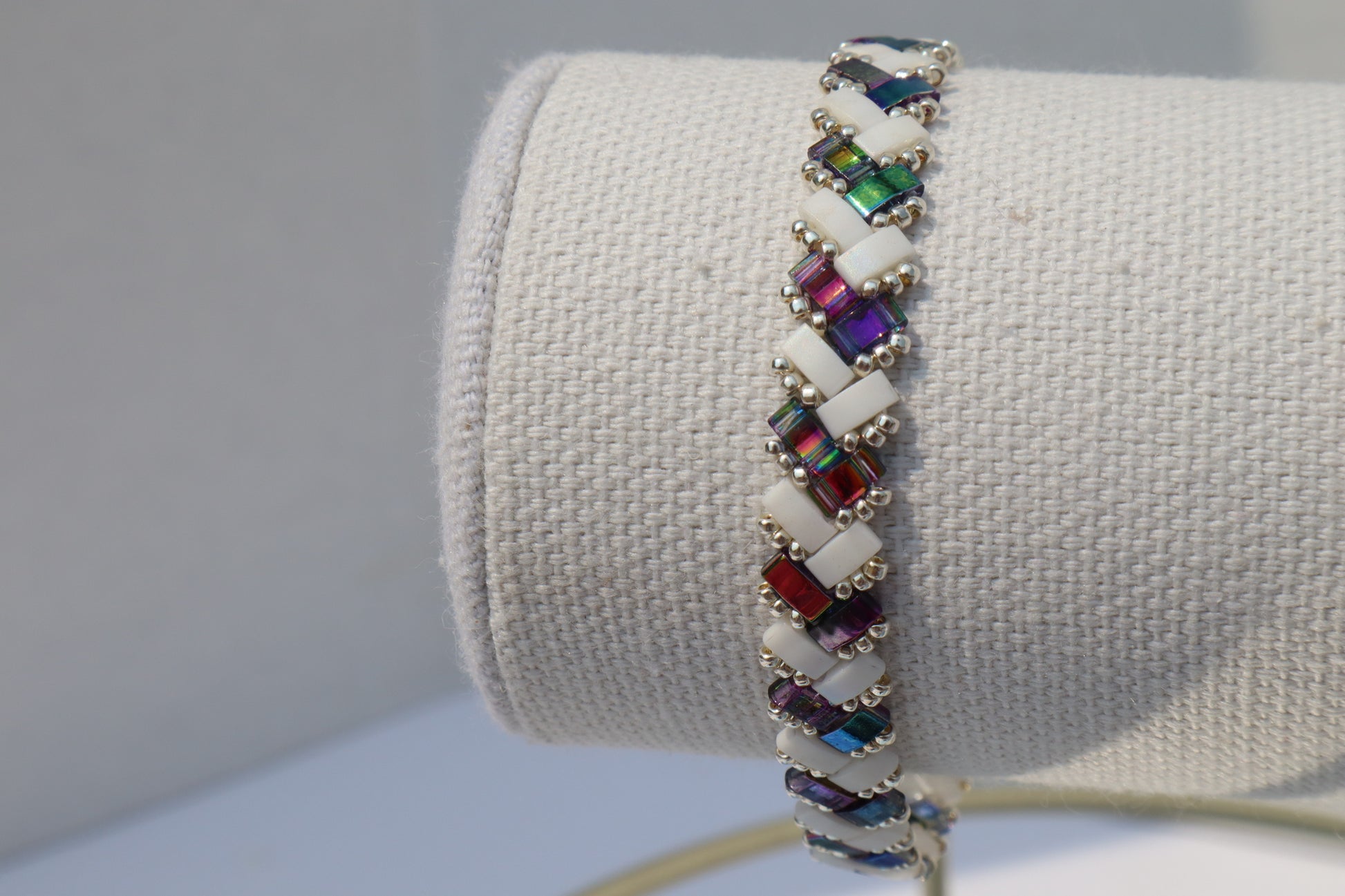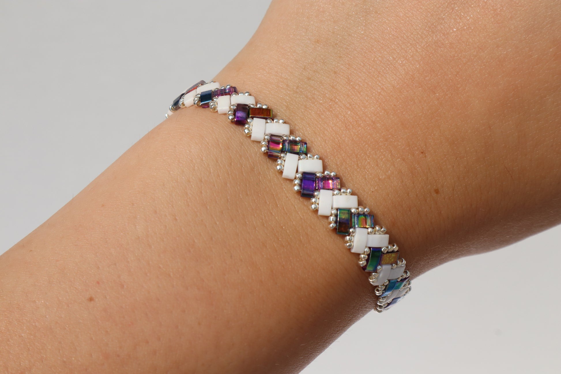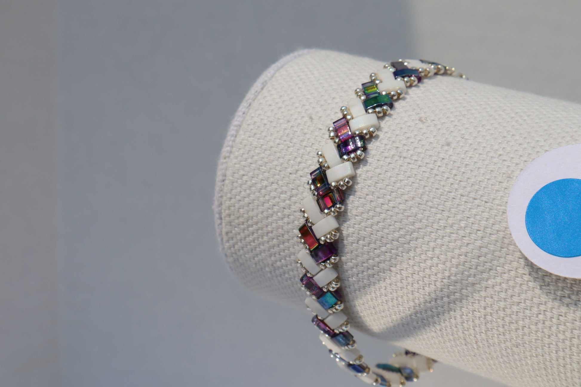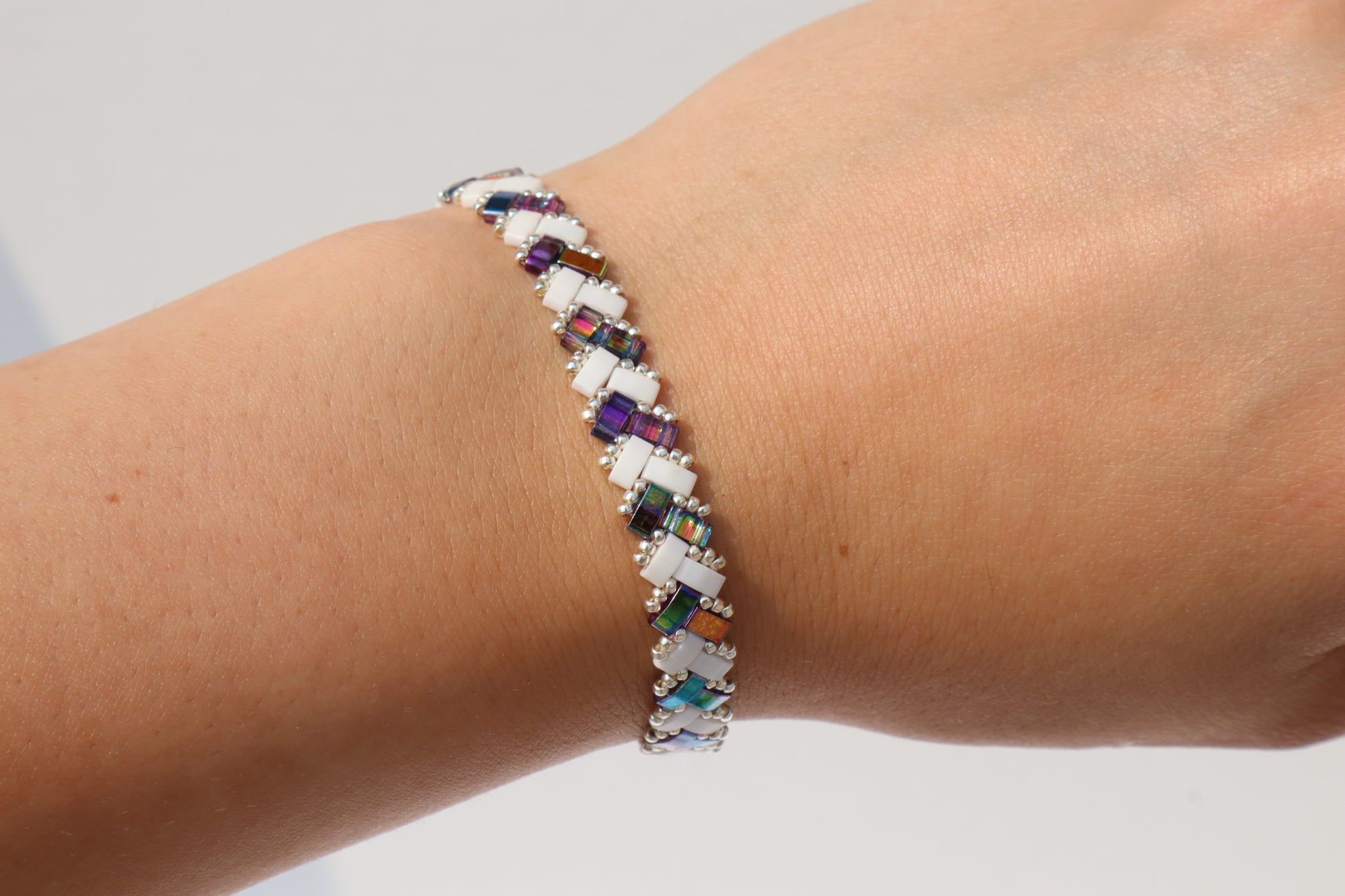 This product features a duo chrome dark blue bead that shifts between many different colors and hues base on the lighting and backdrop. These beads really pop in the sunlight and are absolutely stunning! This bracelet also has matte white ab tila beads and features bright sterling silver spacer beads with lapis lazuli semi-precious stones surrounding the magnetic clasp enclosure.