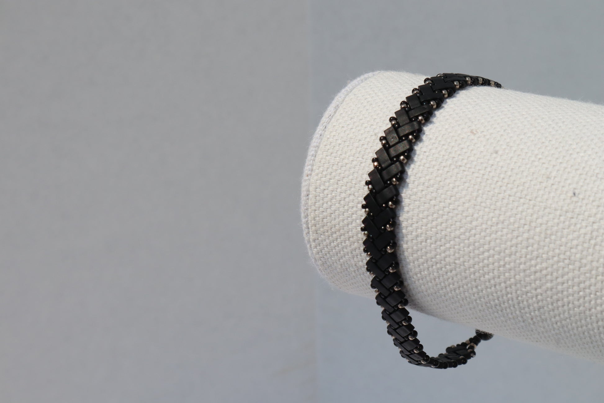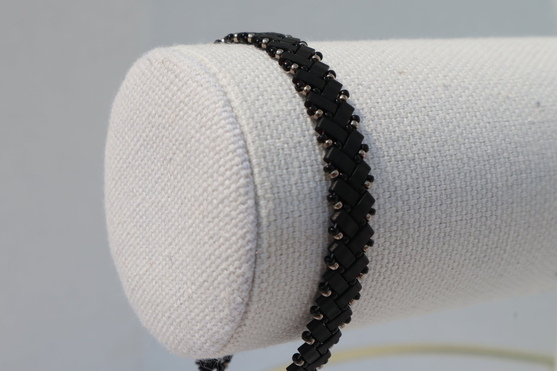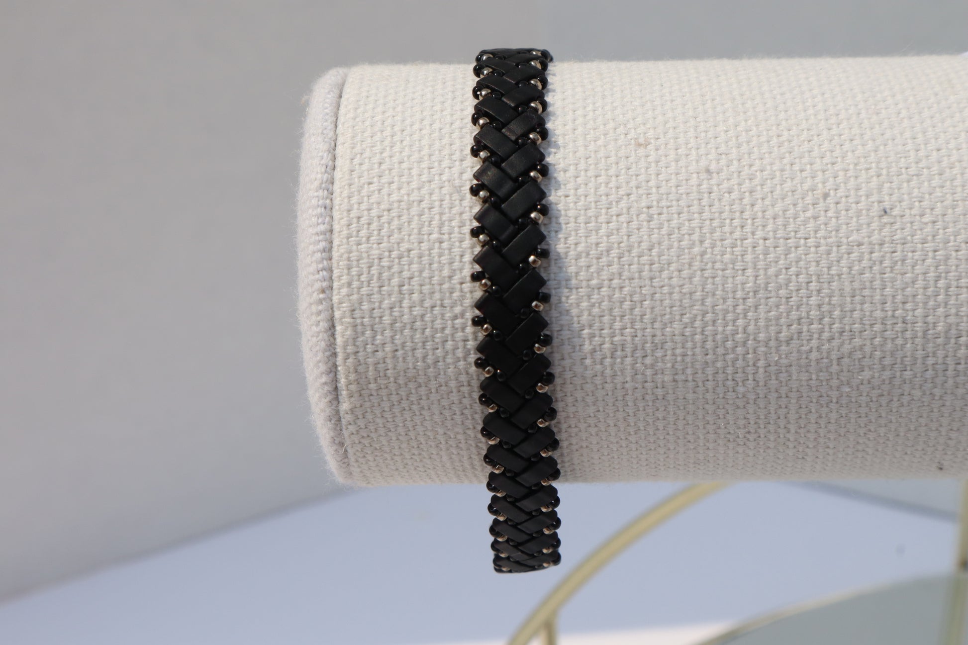 This bracelet is made of high quality glass beads in the color matte black accompanied with nickel colored and shiny black colored beads. This bracelet has a magnetic clasp with network stone accent beads around the enclosure.