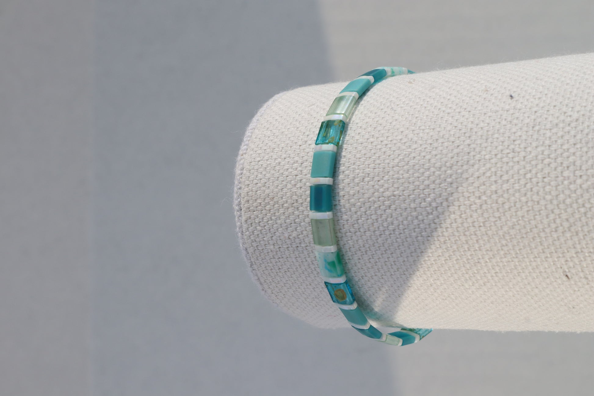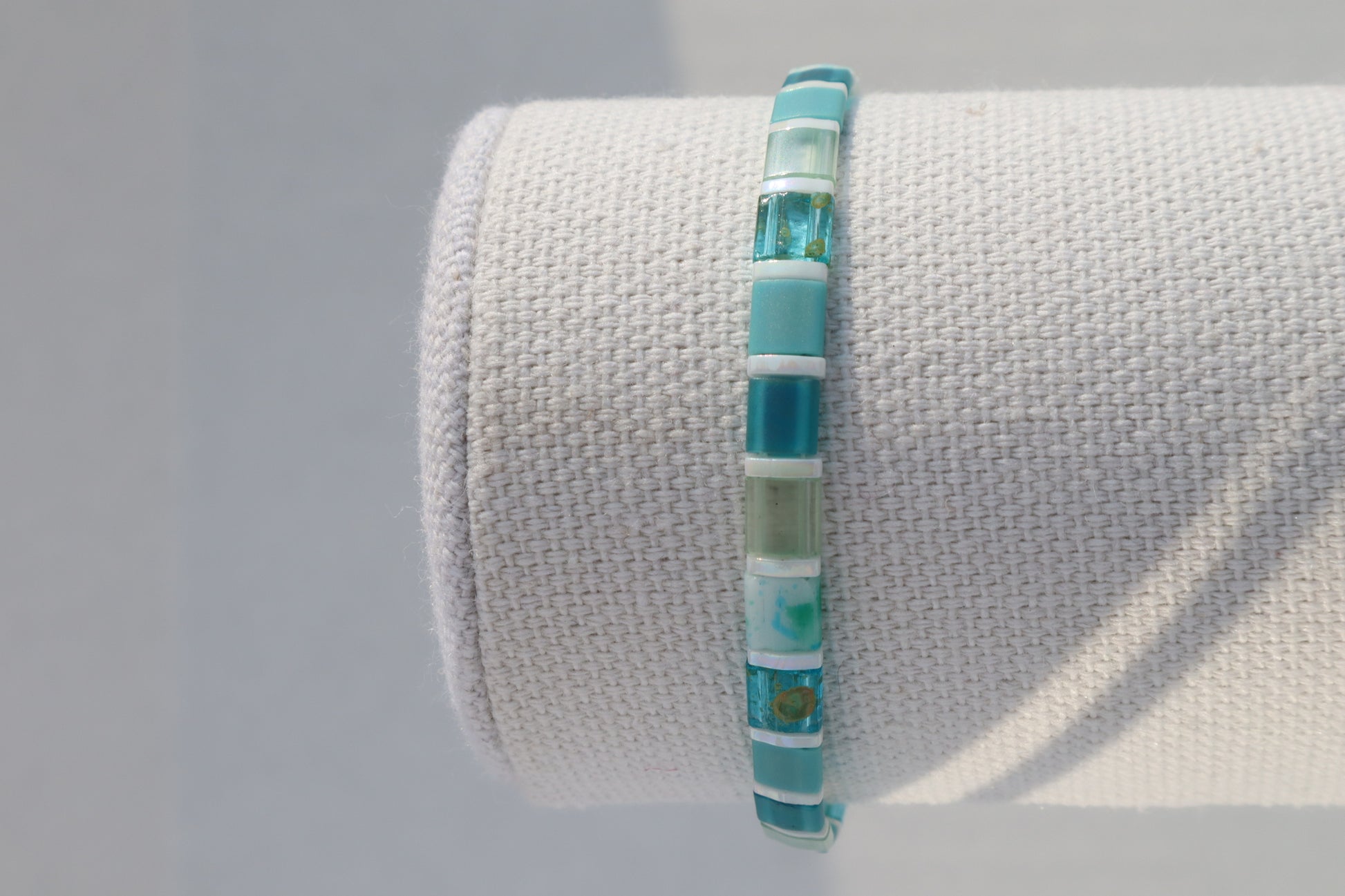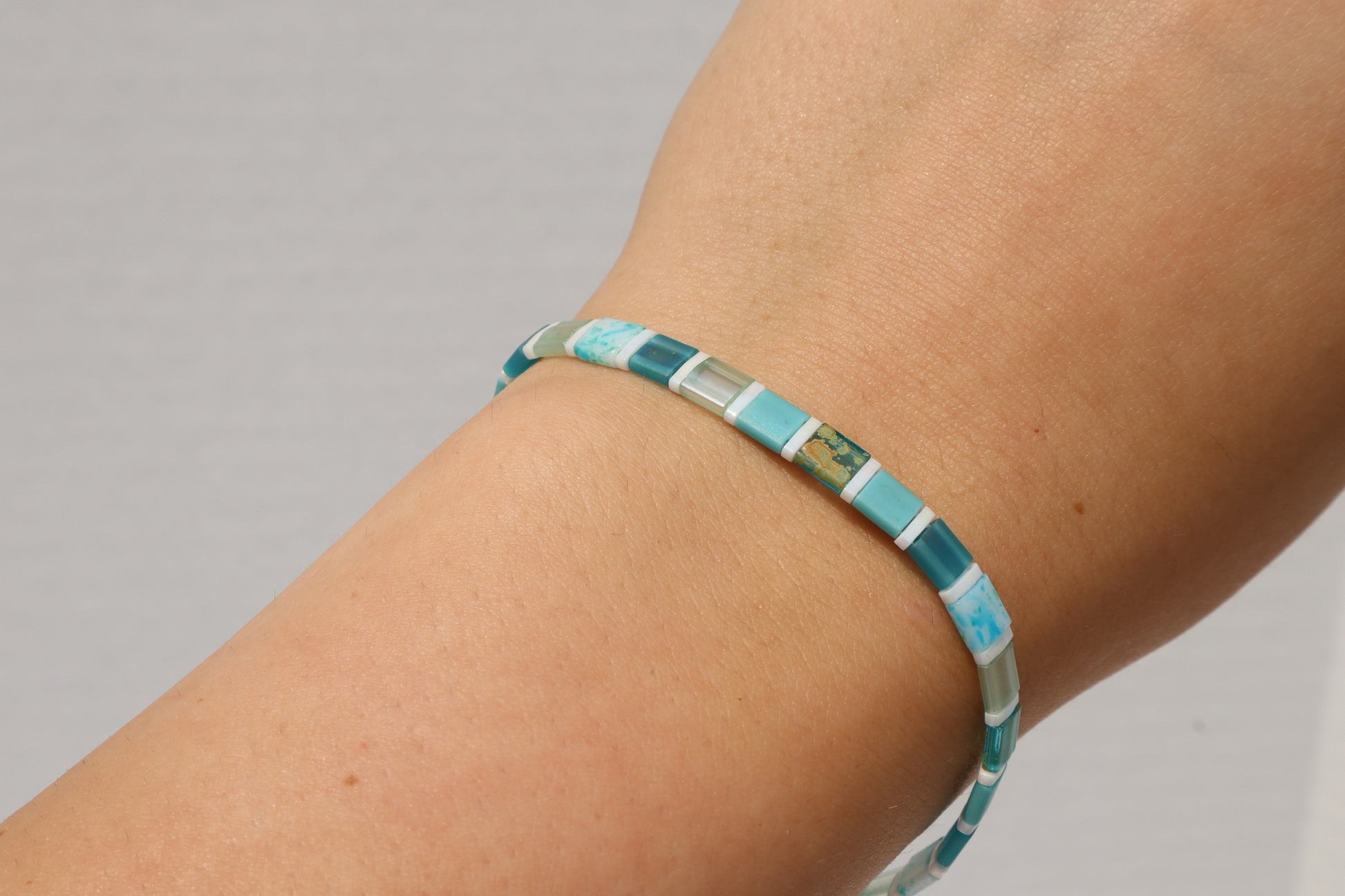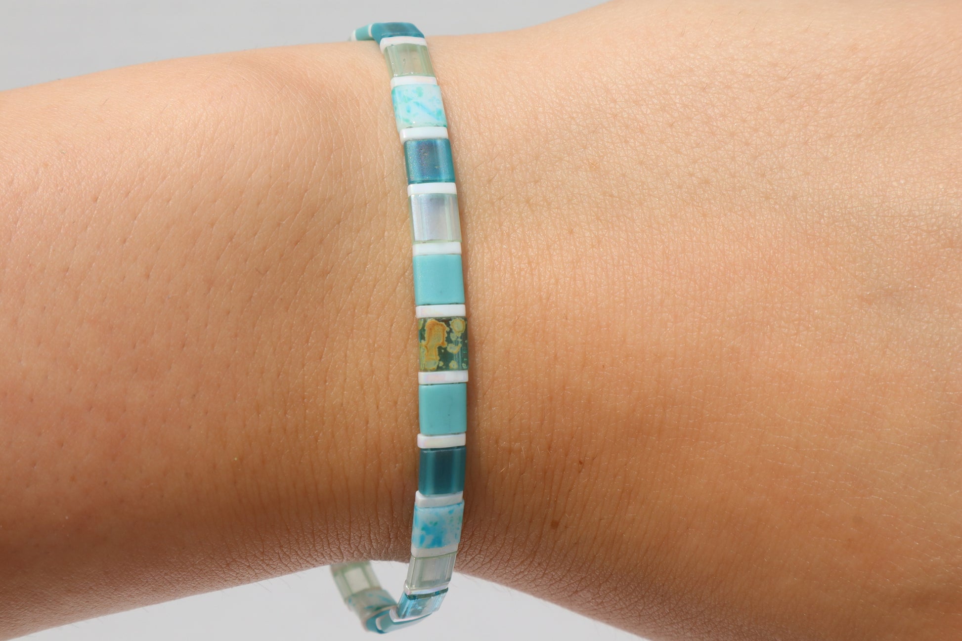 This bracelet features varying colors and hues of the full teal tila beads I offer with pearl white quarter tila spacer beads. This bracelet has a strong magnetic clasp with real turquoise stone beads surrounding the enclosure.