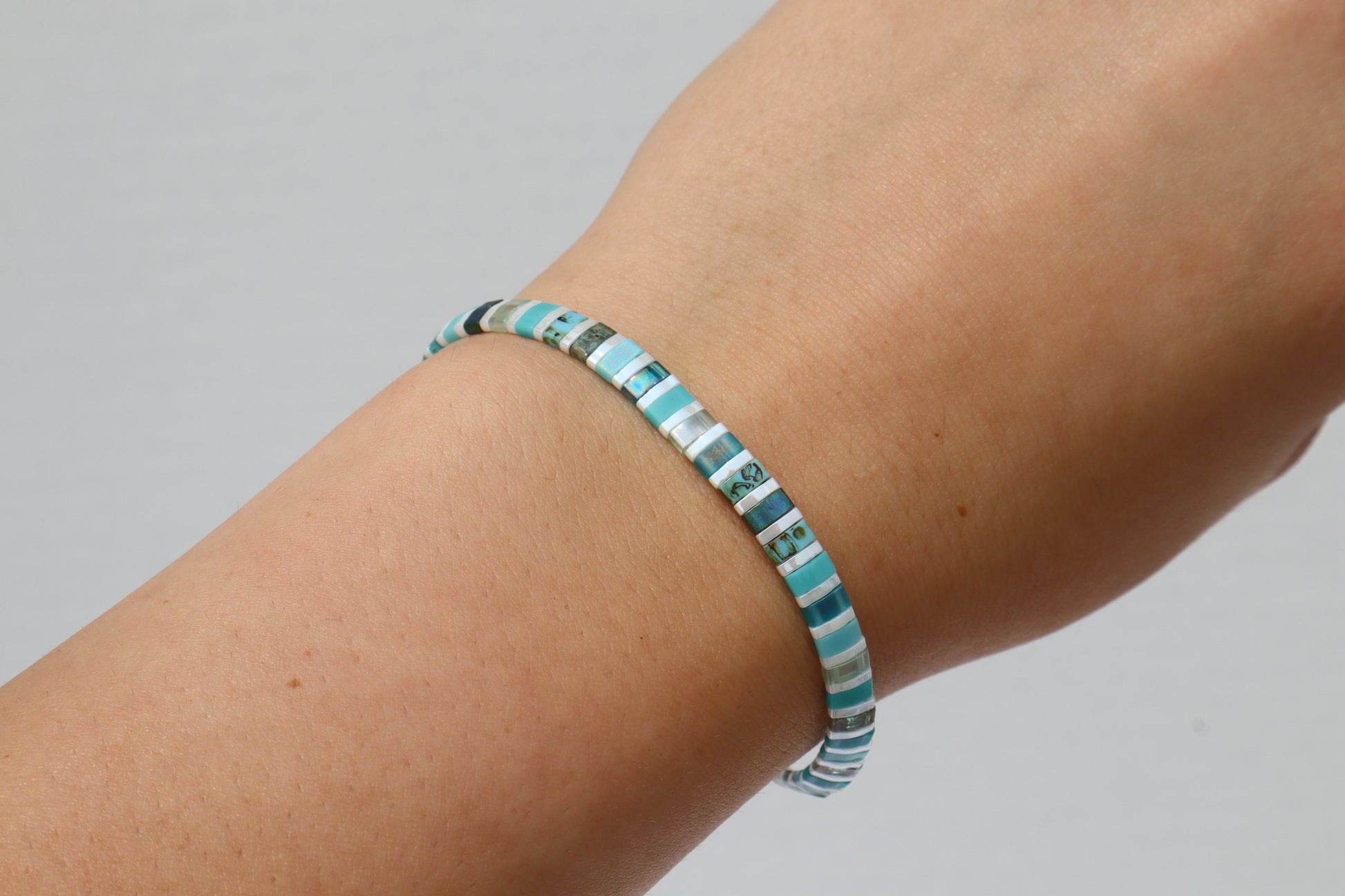 This bracelet is made of high quality glass beads in the assortment of half teal tila beads that I offer. It also has a strong magnetic clasp with real turquoise stone beads around the enclosure.
